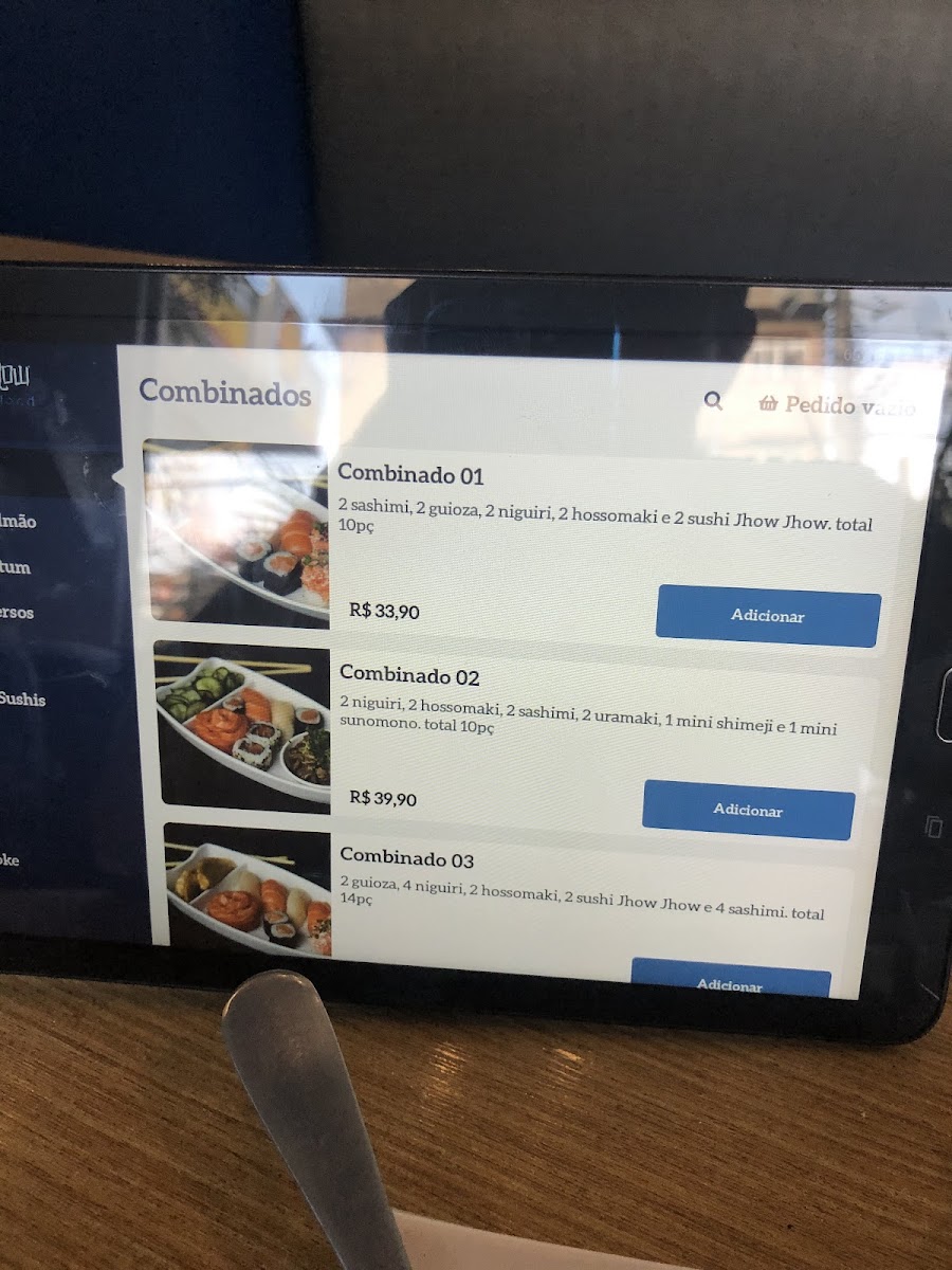 In addition to food items, the menu includes beverages such as Caipisakê de Kiwi, combining traditional Japanese sake elements with a fruit twist.